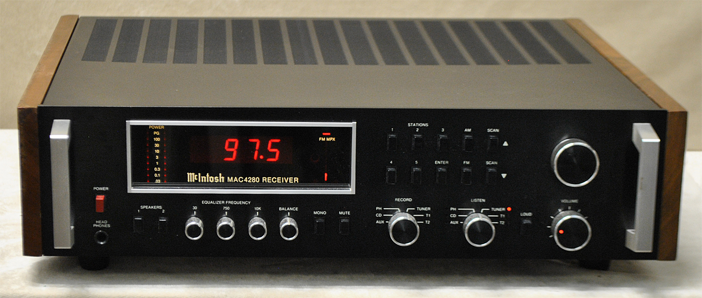 Georgeous Late 80's McIntosh MAC 4280 Receiver w/ Walnut Side Panels. Rated at 80 watts rms/ch into 8 ohms. Great Sounding! Programable Digital AM/FM Tuner, MM/MC Phono, Aux, CD, Processor Loop,Tape 1&2 inputs and Preamp-out/Main-inputs, Speakers A,B, 3) Switched 1) Un-switched AC Outlets, Owners Manual, EX.Cond 9.2