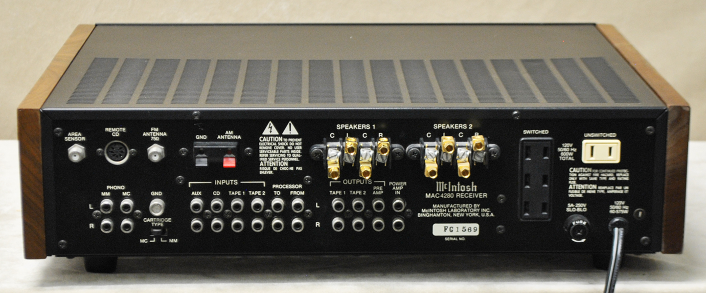 Georgeous Late 80's McIntosh MAC 4280 Receiver w/ Walnut Side Panels. Rated at 80 watts rms/ch into 8 ohms. Great Sounding! Programable Digital AM/FM Tuner, MM/MC Phono, Aux, CD, Processor Loop,Tape 1&2 inputs and Preamp-out/Main-inputs, Speakers A,B, 3) Switched 1) Un-switched AC Outlets, Owners Manual, EX.Cond 9.2